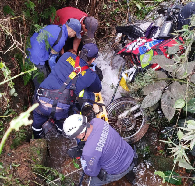 Bomberos de ambos municipios atendieron a un motociclista que cayó a una quebrada y que en su valoración inicial presentó diferentes politraumatismos, entre ellos un trauma cerrado de tórax.