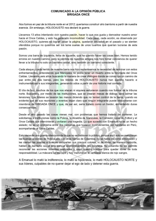 La muerte violenta el pasado sábado (28 de marzo) de Emanuel Rudas Vallejo, de 27 años, apodado Cachucho, integrante de una barra del Once Caldas, acrecentó las diferencias que existen entre Holocausto Norte y Brigada Once.