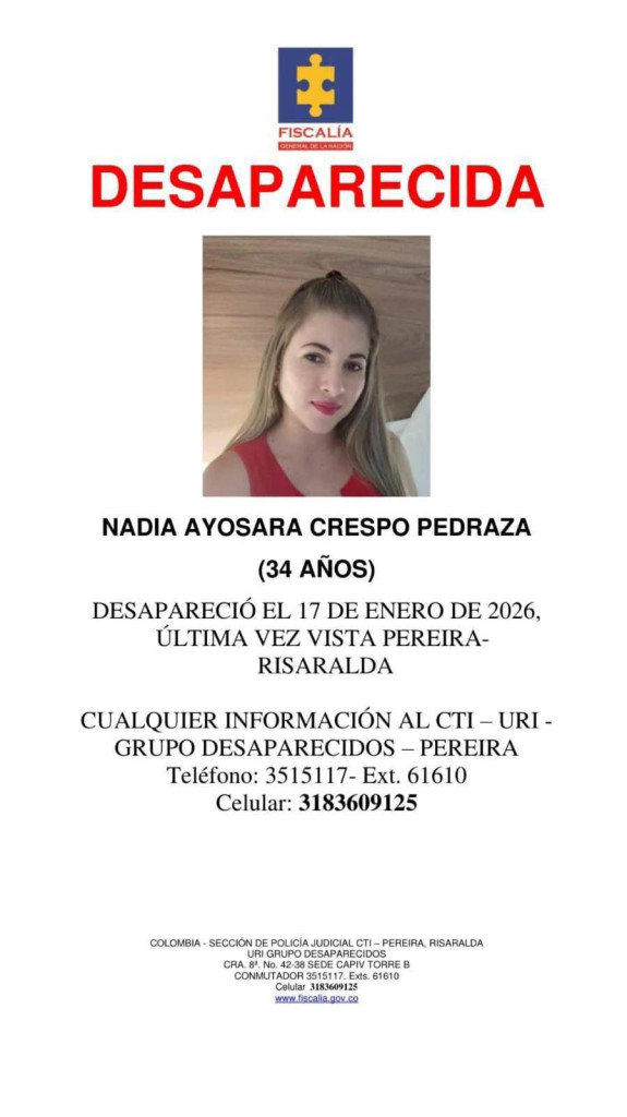 Las autoridades hacen un llamado a la ciudadanía para que cualquier información que permita ubicarla sea comunicada de inmediato al CTI – URI – Grupo de Desaparecidos de Pereira, al conmutador 3515117, extensión 61610, o al celular 318 360 9125.