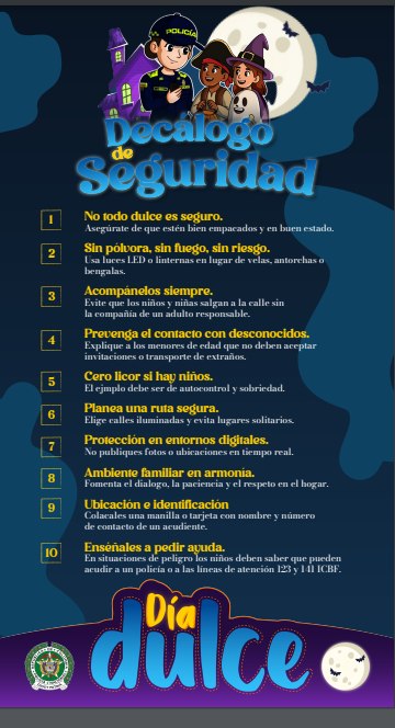 - • Seguridad en los disfraces: Evite el uso de elementos contundentes como espadas o bastones, y máscaras que reduzcan la visibilidad u obstaculicen las vías respiratorias, ya que pueden representar un riesgo.