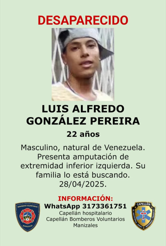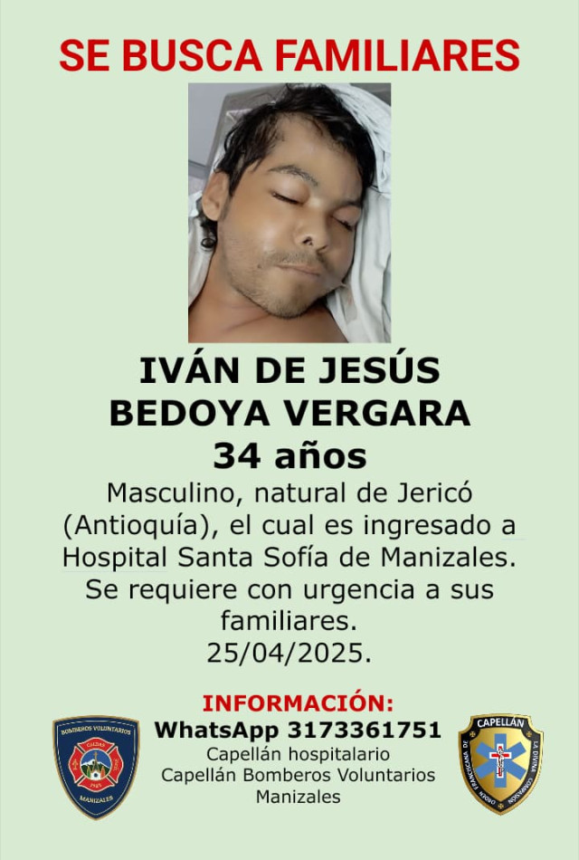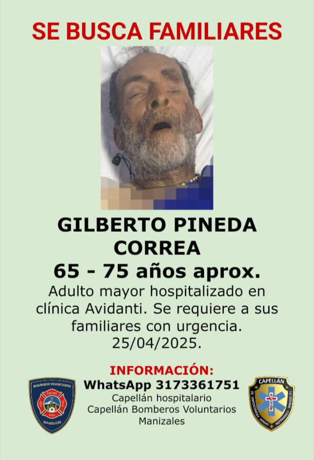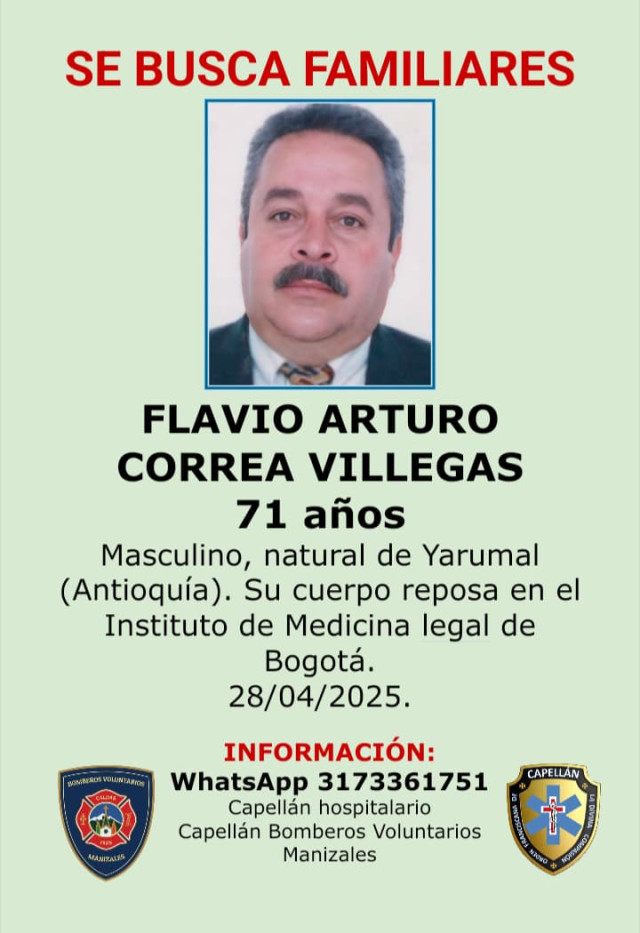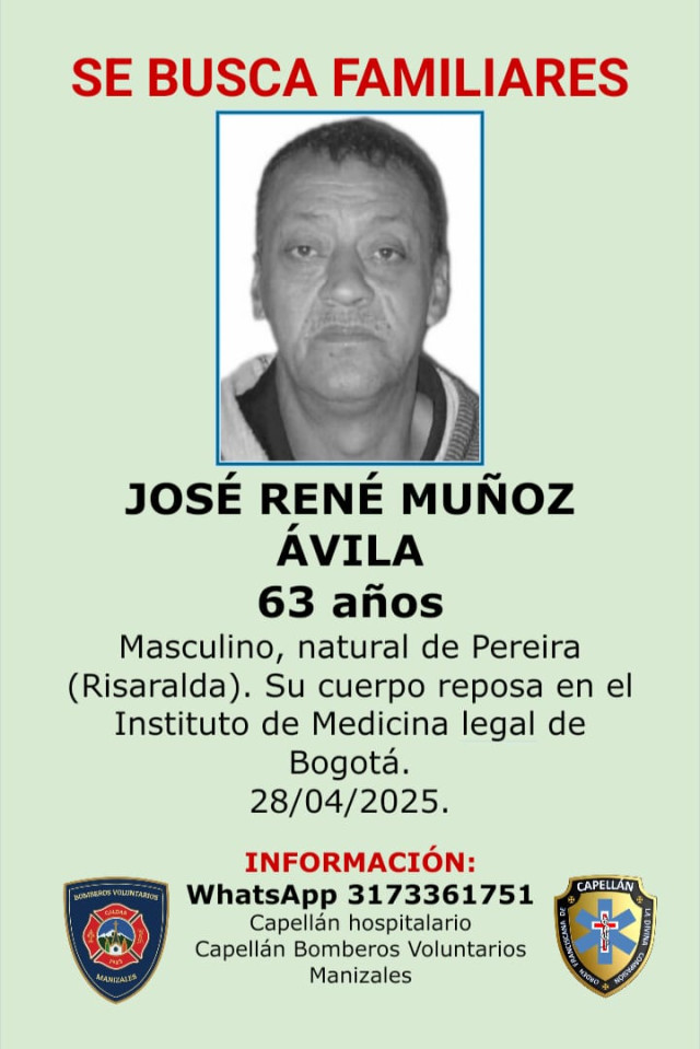 Sucesos 2025-04-28 Algunas de las personas para las que se busca ayuda. Autor Redacción Judicial Fray Juan Torres recurre a quienes sepan algo sobre estas personas o sus familias para ayudar a resolver su situación. Puede llamar al número del volante. Temas Destacados (etiquetas) Manizales Instituto Nacional de Medicina Legal y Ciencias Forenses