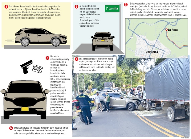 3. En la persecución, el vehículo fue interceptado a la entrada del municipio (sector La Roca), donde el conductor de 33 años, natural de Manizales y apodado Chorizo, en un intento por evadir el cerco policial, perdió el control del automotor y colisionó con dos furgones. Resultó lesionado y fue trasladado hasta el hospital local.