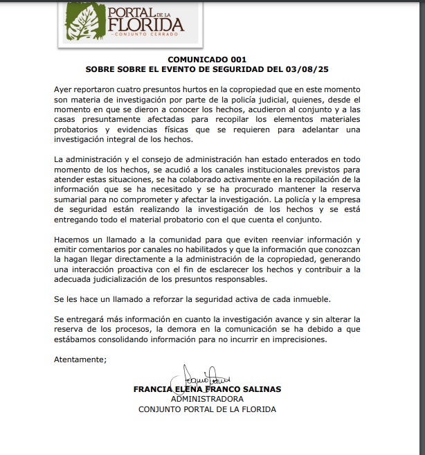"Reportaron cuatro presuntos hurtos, que en este momento son materia de investigación por la policía judicial que, desde el momento en que se dieron a conocer los hechos, acudieron al conjunto y a las casas presuntamente afectadas para recopilar los elementos materiales probatorios y evidencias físicas que se requieren para adelantar una investigación integral de los hechos", explicó Francia Elena Franco Salinas, administradora del Portal de La Florida.