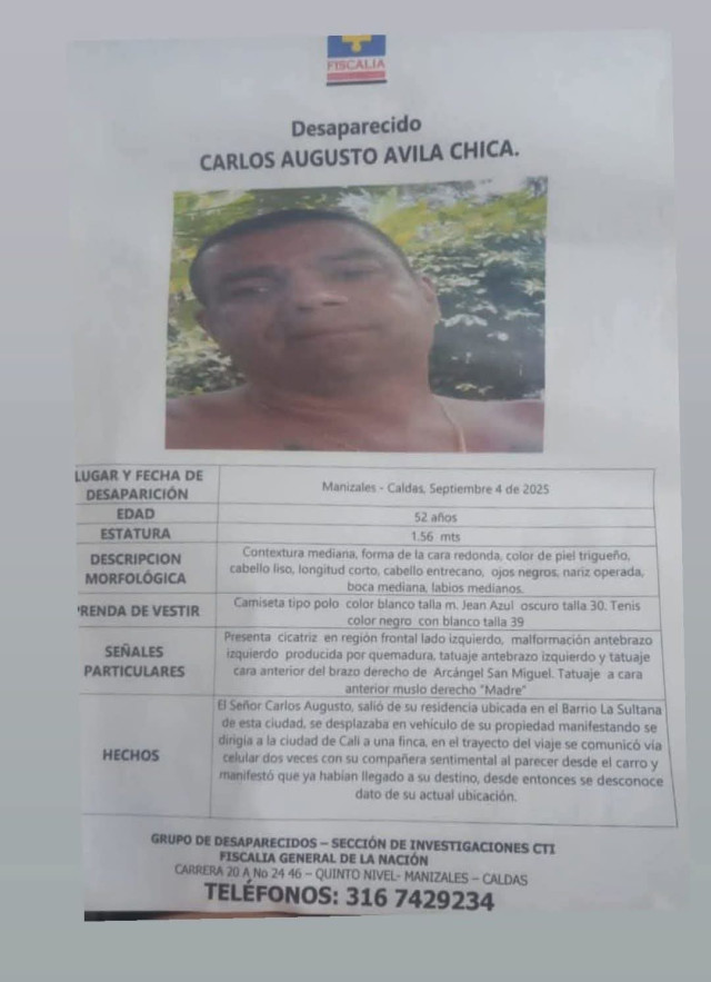 Carlos Augusto Ávila Chica está desaparecido desde el 4 de septiembre de este año.