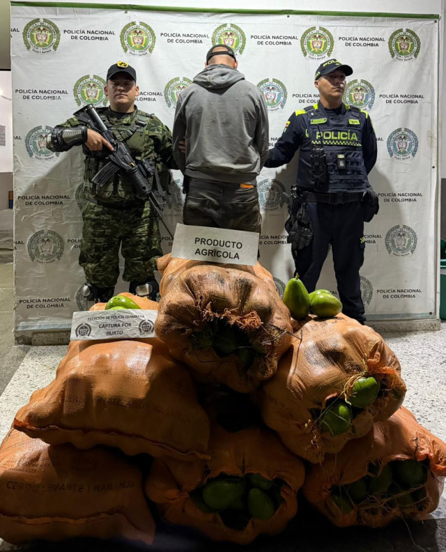 En vía pública de la vereda El Jazmín, kilómetro 2, vía Quimbaya - Alcalá, en coordinación con el Ejercito Nacional, aprehendieron a un hombre de 31 años de edad, quien habría hurtado seis bultos de aguacate de una finca.