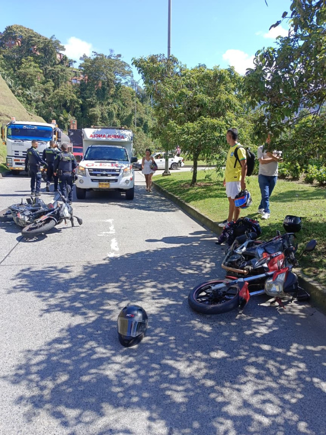 GER auxilió en la mañana de hoy, en la avenida Kevin Ángel, sector Piamonte, a Julián Steven, de 26 años, quien se accidentó en moto contra vehículos. Tenía dolor en espalda, quemadura por fricción y edema. Lo llevaron a La Presentación.