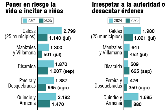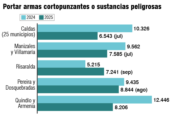 38.419 armas cortopunzantes incautadas en todos los municipios del Eje Cafetero. Esta cifra entregó la Policía, en datos recolectados hasta agosto y septiembre del 2025. Es, según la Institución, la infracción que más se comete por Código de Seguridad y Convivencia Ciudadana.