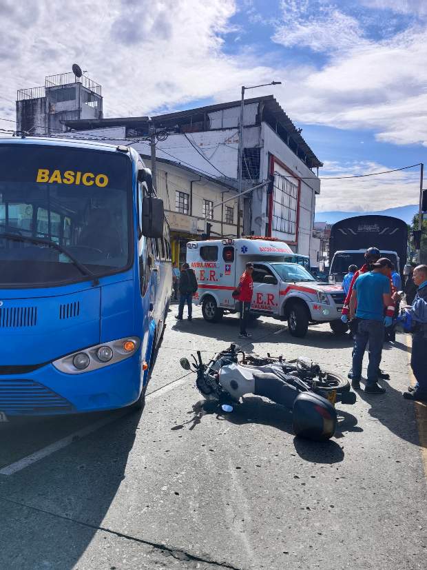 En la carrera 18 con calle 23, Jorge Gabriel Osorio Molano, de 54 años, terminó lesionado en el choque de una moto y una buseta. "Tuvo deformidad en clavícula izquierda, con dolor y limitación funcional de la extremidad, con trauma en pierna izquierda y limitación para la movilidad", explicó el GER, que lo auxilió este jueves 22 de mayo en Manizales.