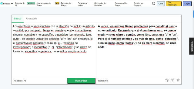 Editpad es básicamente un bloc de notas en línea que también tiene diferentes herramientas de escritura. Uno de ellos incluye un humanizador de IA. Está disponible en planes gratuitos y de pago y pretende operar con diversos conjuntos de datos y algoritmos inteligentes para un trabajo eficiente.