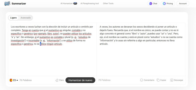 El nombre lo dice todo: Humanizar Texto es una herramienta de uso totalmente gratuito para convertir texto generado por bot en uno escrito por humanos para evitar la detección de IA. La herramienta pretende utilizar una base de datos diversa y un conjunto inteligente de algoritmos para realizar el proceso de humanización de forma rápida y eficiente.