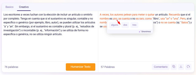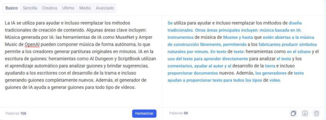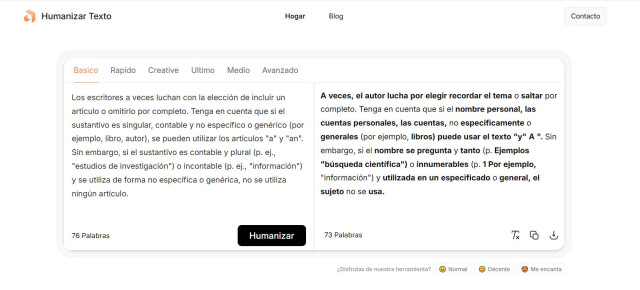 Por último, pero no menos importante, Humanizar Texto AI es una herramienta freemium que efectivamente hace que la IA generada sea indetectable. Ofrece dos modos para este propósito: uno es Básico, y el otro es Creativo. Ambos están disponibles de forma gratuita.