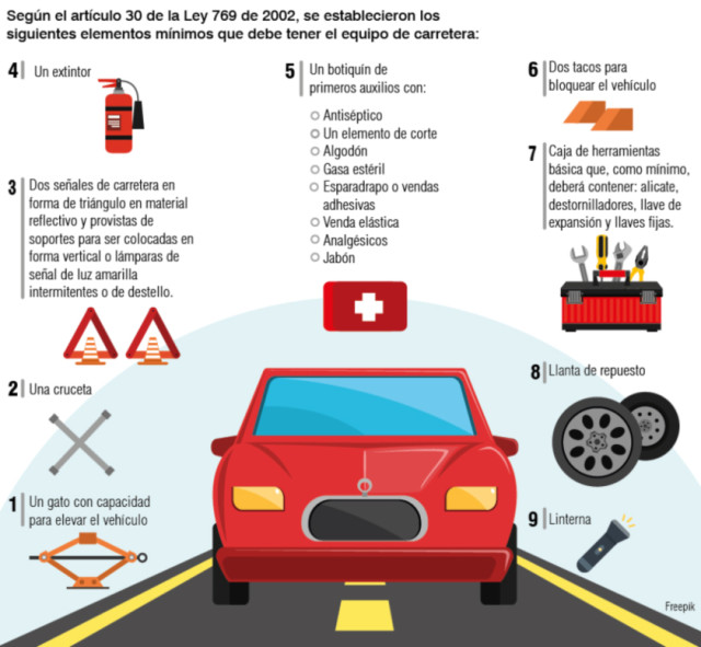 Estos elementos hacen parte del kit de carretera, que todo conductor colombiano debe portar en su automotor para circular en las vías nacionales, según el artículo 30 de la Ley 769 del 2002 en el Código Nacional de Tránsito.